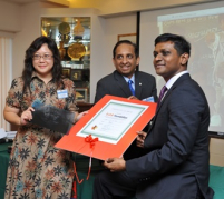 (左起)香港大學兒童齒科臨床助理教授王海明牙科醫生、香港大學牙醫學院院長西門雅慨教授、及香港大學牙醫學院三年級博士研究生暨D.O.B基金會創辦人及董事於2013年8月27日D.O.B基金會啟動儀式上展示該基金會的「出生證書」。