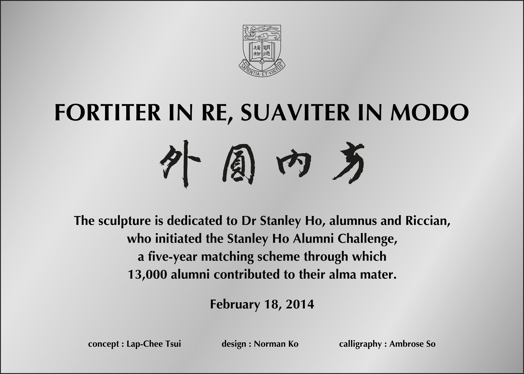 香港大學於今天 (2月18日)在百周年校園豎立一座雕塑,名為「外圓内方」 “Fortiter in re, Suaviter in modo” , 藉此銘謝校友何鴻燊博士熱心支持母校。