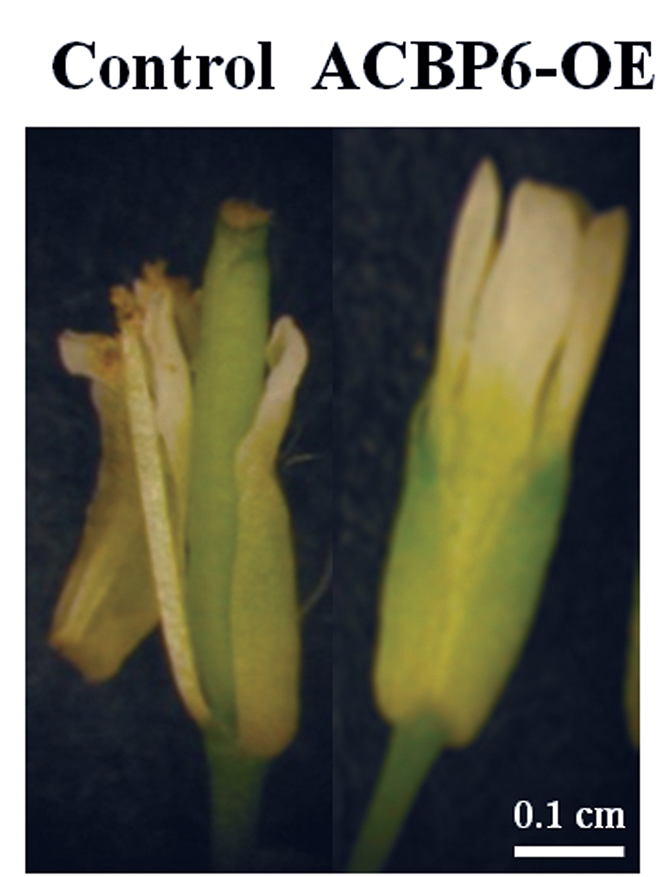 圖1 過量表達ACBP6 的植株花朵在冷凍處理後依然顯示完整花瓣(右),而對照組花朵(左)在冷凍處理後花瓣已被嚴重破壞。