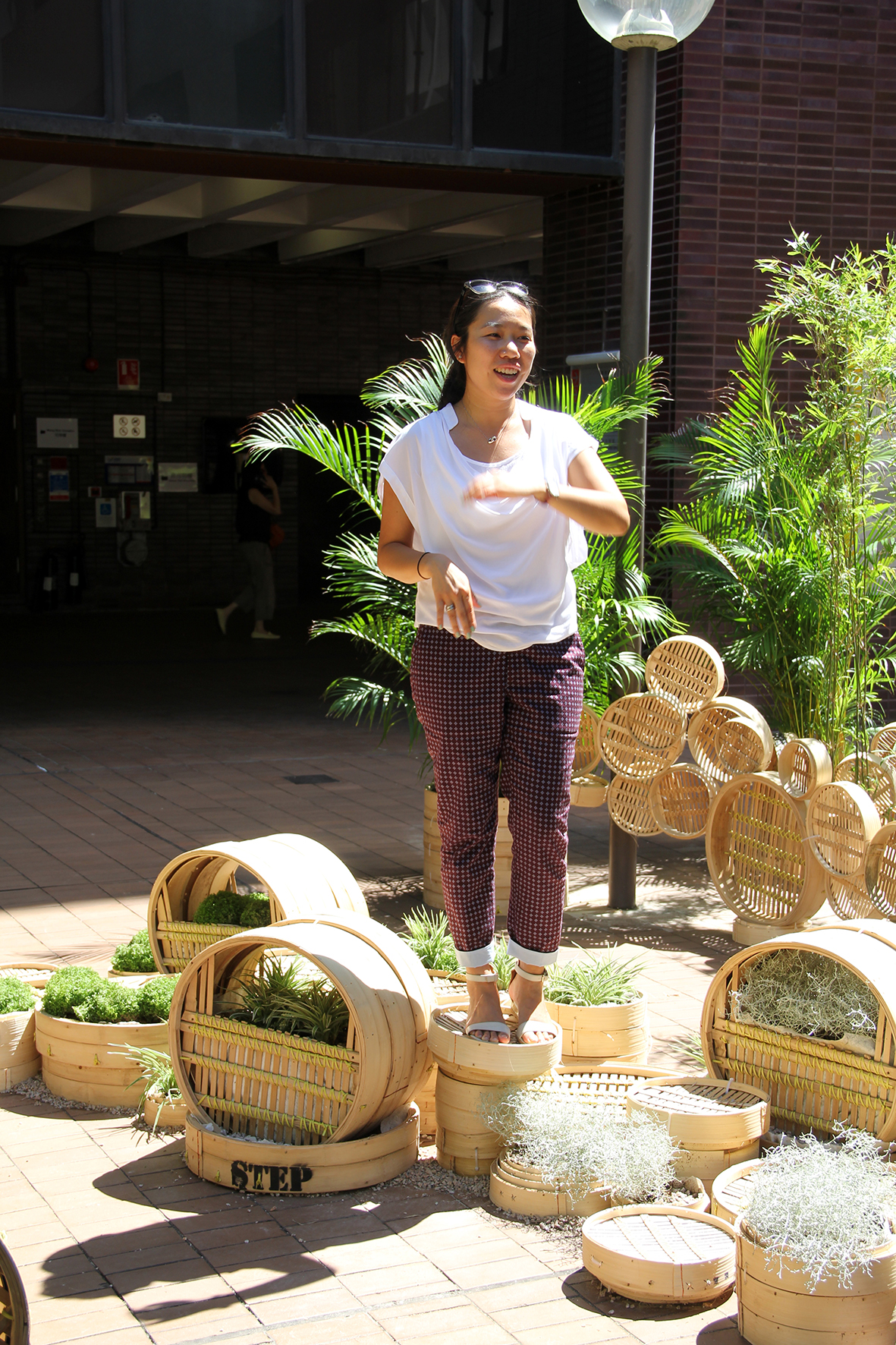 今年的工作坊帶領一眾中學生在香港大學校園內利用中國傳統竹蒸籠和植物,設計並建造一個1:1的空間裝置 ─「遊樂•園」(’PLAYSCAPE’)─ 藉此希望能營造一個積極參與公共空間的氛圍,並希望讓大家對園境建築學有新的看法。學生以一系列「遊玩」 作概念的動詞,例如「坐」、「躺」、「踏」、「躲」、「伸」、「穿越」等為主題來設計他們的藝術裝置,讓遊人與裝置中的植物作出互動。