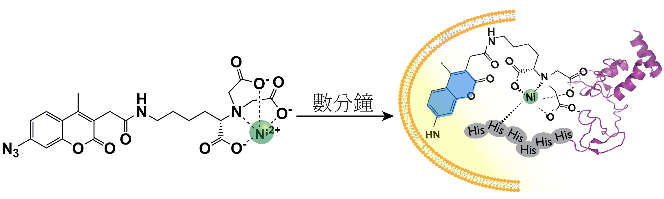 因此,構建具良好膜滲透性的小分子螢光探針以實時監測活體細胞內的組氨酸標籤蛋白非常重要,有助於原位研究各種細胞中的生物反應及機理。