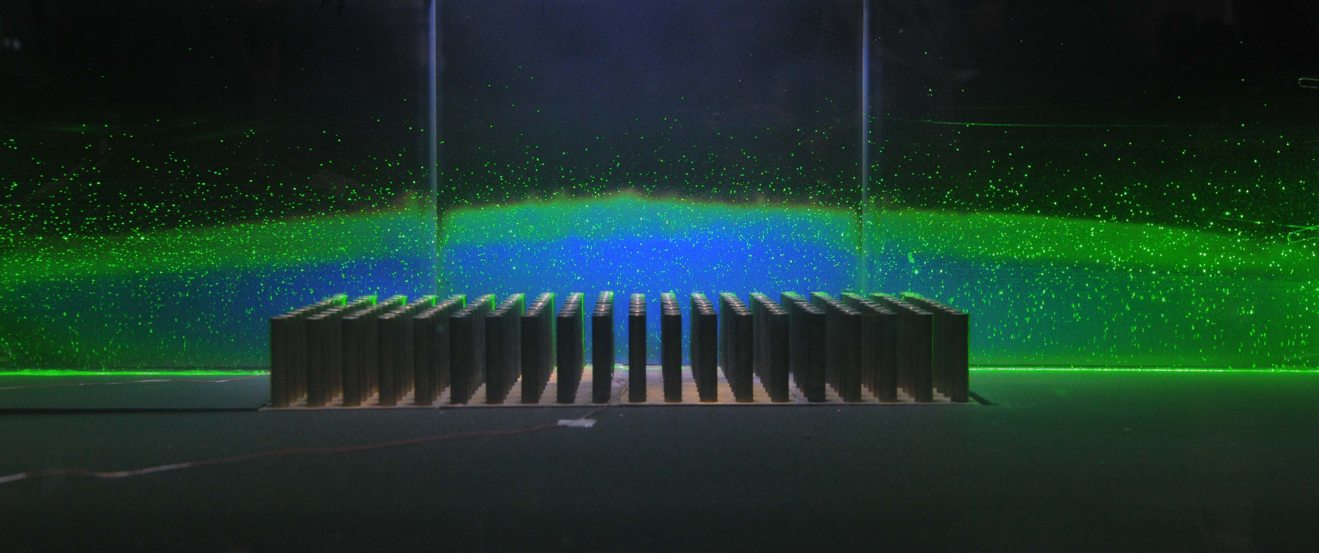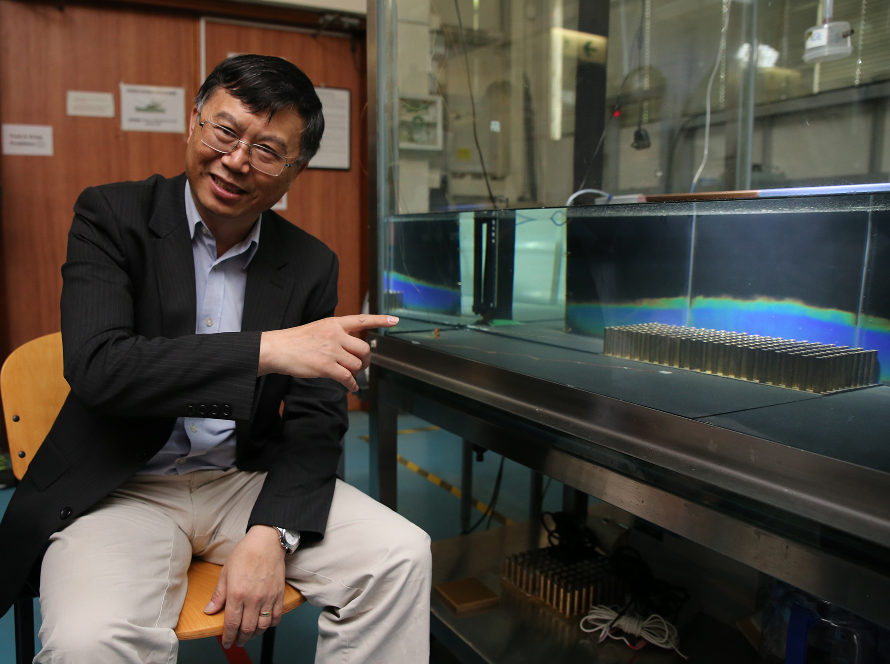 港大機械工程系系主任李玉國教授透過水箱中理想城市穹頂模型,來理解城市通風環境的物理機理。
