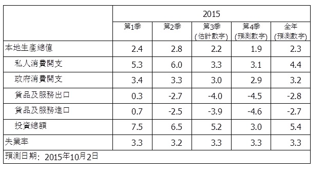 預期香港經濟將從2015年上半年增長2.6%,減慢至下半年的增長2.0%。2015年全年實際GDP增長為2.3%,主要是由本地需求所帶動。預計本地需求增長佔本年度實際GDP整體增長2.6個百分點,而外部需求則拉低增長0.3個百分點。