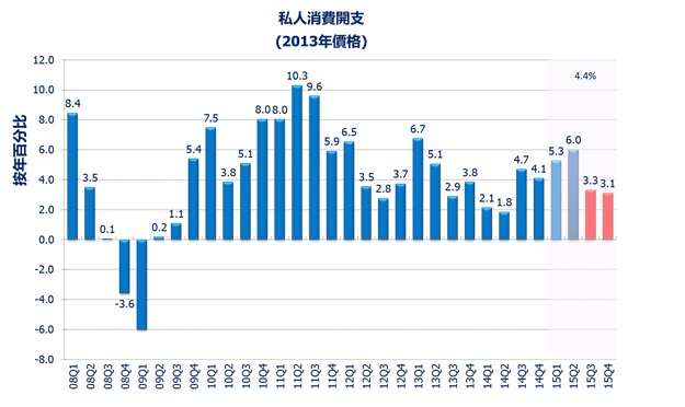 私人消費開支在2015年第二季增長6.0%。在漸趨謹慎的消費信心下,私人消費開支放緩至第三季的估計3.3%及第四季的3.1%。預料2015年全年私人消費開支增長預計為4.4%。