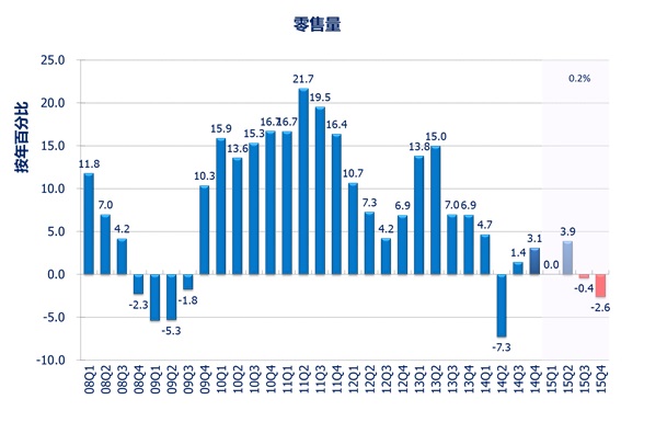 2015年8月零售量錄得按年下跌0.2%,從2月以來連續六個月恢復增長中逆轉。鑑於遊客的消費減少、“一周一行”簽證的政策措施逐步落實,以及股價調整引起消費者信心疲弱的情況下,預計本季度的零售量增長將受到抑制。零售量從2015年第二季的3.9%增長中逆轉,在第三季預計下跌0.4%,而第四季更進一步下跌2.6%。預期2015年全年零售量只有0.2%的升幅。