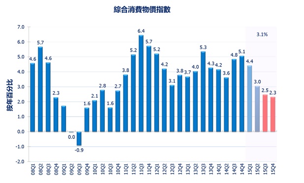 預料就業市場依然穩定,估計2015年第四季失業率維持於3.3%。美元升值有助減輕入口通脹,使本港通脹壓力舒緩。預計2015年第四季的通脹率為2.3%。”香港大學經濟學首席講師王家富博士指出。