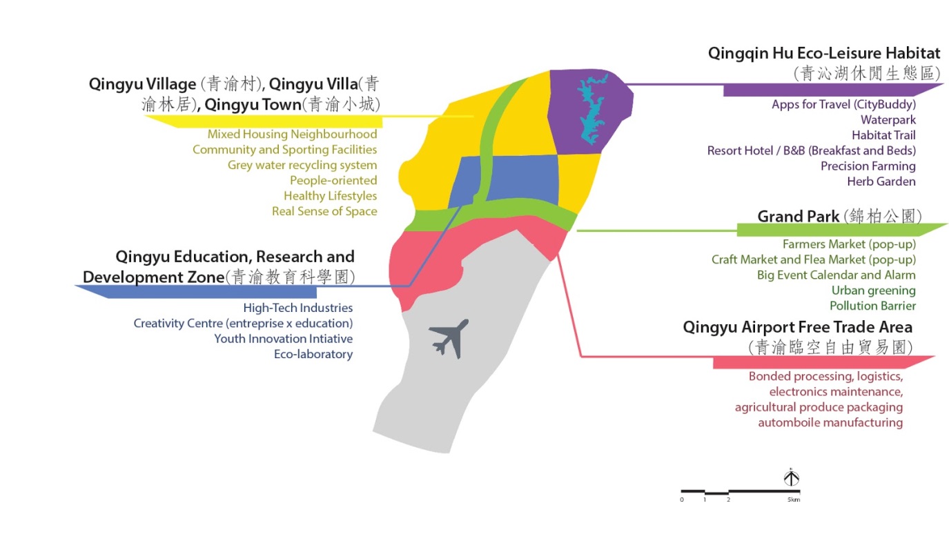 香港大學城市研究文學士課程四年級生參賽團隊由鄭嘉欣(隊長)、張陽薇、黃綽雯、楊詠儀及林天淇(醫學三年級生)組成。香港大學參賽團隊提出了“SOW生態城”的理念,即空間(Spatial)+ 可操作(Operational) = 可行(Workable)。項目位於重慶兩江新區的王家鎮和木耳鎮,SOW生態城地處山地,占地面積約61.5平方公里,項目由青渝臨空自由貿易園、青渝教育科學園、青渝人家和青沁湖休閒生態區及錦柏公園五大主要園區構成。參賽方案充分利用項目所在地的“進入中國內陸的北大門”區位優勢,提出通過發展生態旅遊和確保食品安全的前提下構建區域復原力的發展策略。