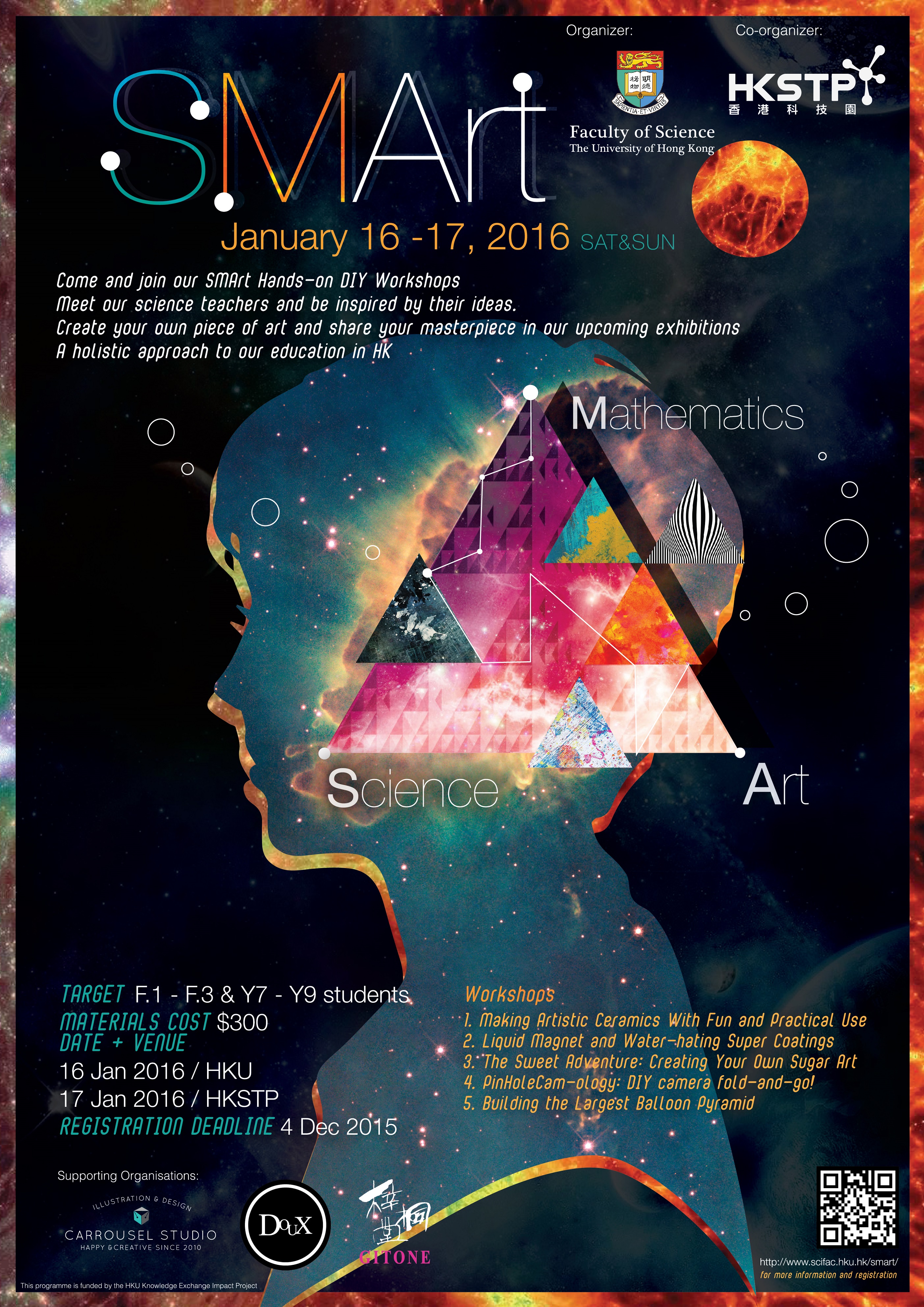 作為本地科技普及的先行者,香港大學理學院和香港科學園將於2016年1月16日及17日合辦「數理藝坊」,讓同學透過講座和工作坊,親身體驗科學、數學與藝術之間的緊密關係。歡迎就讀中一至中三,或國際學校第7 至9 班的同學報名參加。
