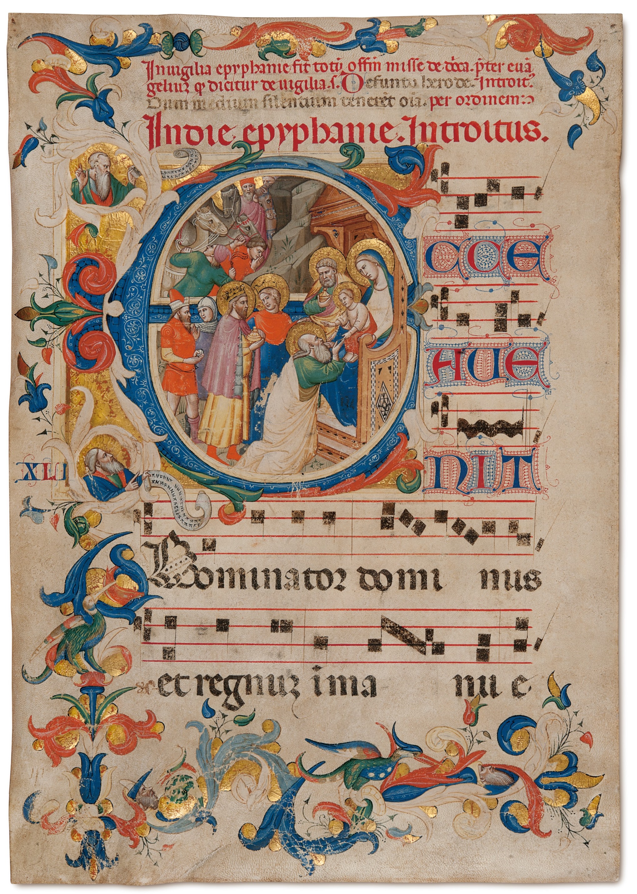 《階台經》書頁,描繪「博士來朝」(取材自「基督生平」),其中「Ecce avenit」的佔行大寫首字母「E」經中世紀傳統出版風格修飾與變形
