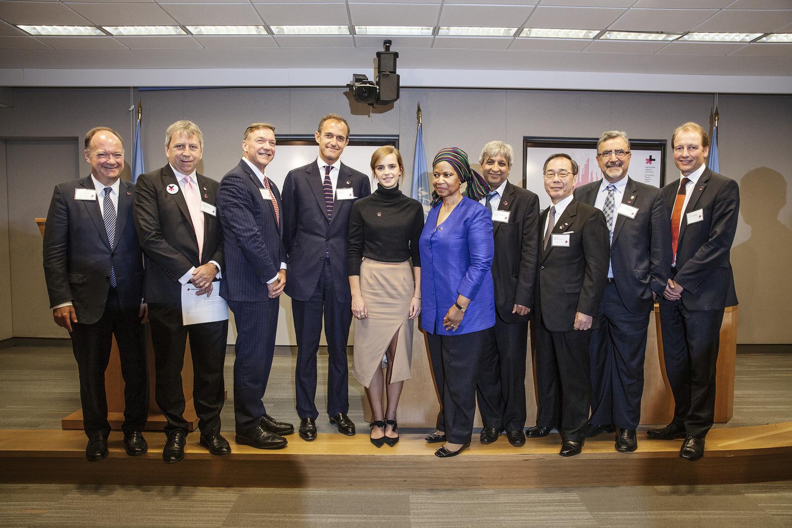 港大校長馬斐森教授(左二)與聯合國婦女署執行主任姆蘭博-努卡女士(右五)、聯合國婦女署全球親善大使艾瑪·沃森 (左五)及來自美國喬治城大學、美國石溪大學、法國巴黎政治大學、南非威特沃特斯蘭德大學、日本名古屋大學、加拿大滑鐵盧大學和英國萊斯特大學的校長。