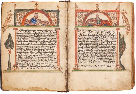 少數幾件亞美尼亞的彩繪手抄本來自中世紀以前。成於公元七世紀的彩繪手抄本單例是已知最早的同類文獻。自公元八世紀起,統治亞美尼亞的阿拉伯人壓制基督教的藝術表達,因此在公元九世紀中期哈里發統治結束以前,該類作品銷聲匿跡。雖有少量成於公元九世紀晚期至公元十三世紀的作品流傳於世,亞美尼亞的彩繪手抄本藝術直到公元十二及十三世紀才最終成就氣候。以該時期的作品為開端,是次展覽將按時序以圖文並茂的形式,遂一引介這教導基督教福音的漫長傳統。為本次展覽錦上添花的,更有來自格魯吉亞、描繪有四福音書作者的彩繪手抄本葉冊。