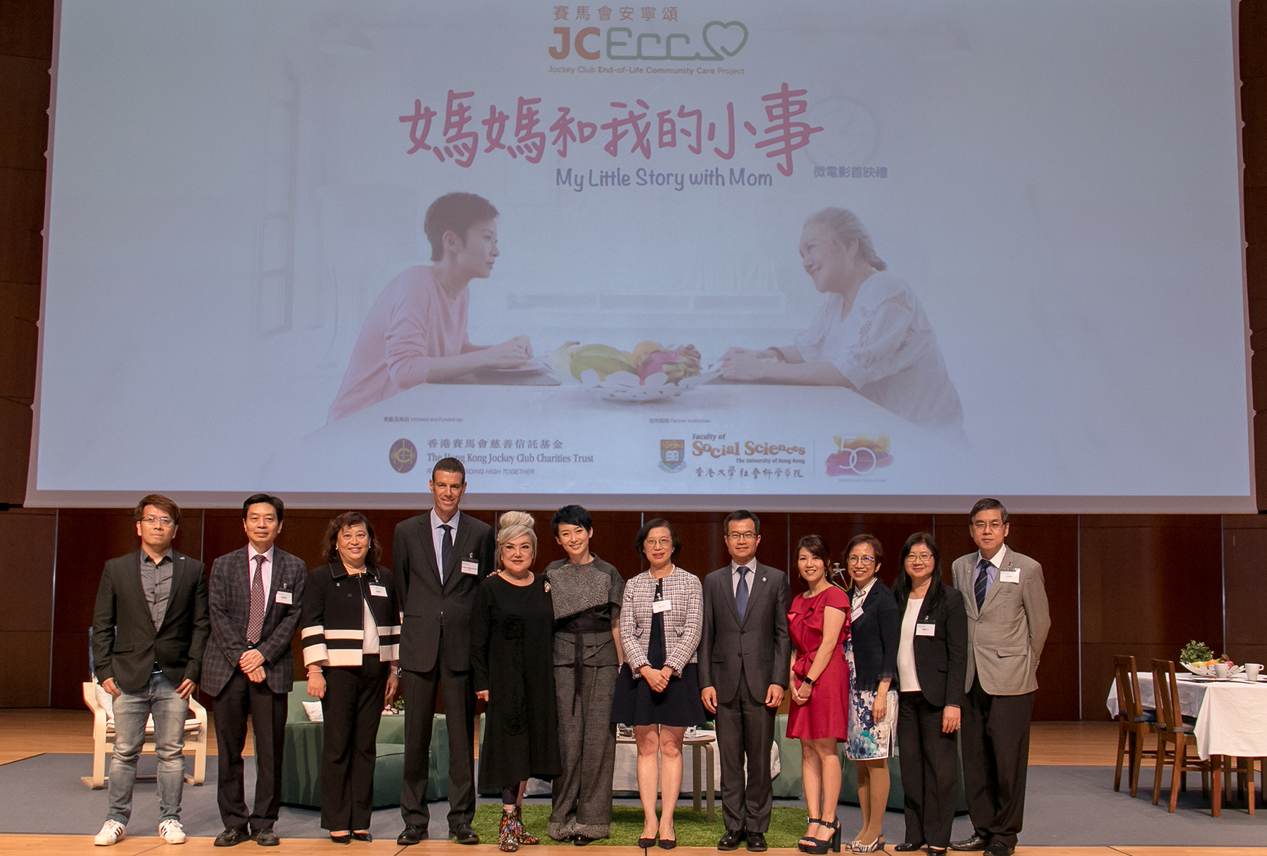 「賽馬會安寧頌」 - 「媽媽和我的小事」微電影首映禮暨導演、演員分享會及公眾座談會: (左起)香港大學協理副校長(教學與學習)郭予光教授、香港老年學會會長梁萬福醫生、香港大學社會科學學院社會工作及社會行政學系副教授及「賽馬會安寧頌」項目總監周燕雯博士、香港大學社會科學學院院長夏偉立教授、「媽媽和我的小事」微電影演員邵音音小姐、「媽媽和我的小事」微電影演員周家怡小姐、食物及衛生局局長陳肇始教授、香港賽馬會慈善及社區事務執行總監張亮先生、「媽媽和我的小事」微電影導演黃懿德小姐、香港大學社會科學學院社會工作及社會行政學系教授及「賽馬會安寧頌」項目總監陳麗雲教授、香港賽馬會慈善事務部主管(長者、復康、醫療、環保及家庭)陳載英女士,以及靈實司務道寧養院院長梁智達醫生