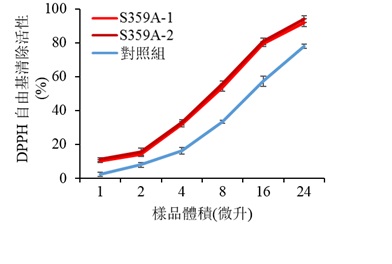 圖2 抗氧化活性分析表明,過量表達S359A番茄,在成熟時(即受粉後57天),果實中的類胡蘿蔔素(紅色及深紅色線)的抗氧化活性高於對照組(藍色線)。S359A-1 和S359A-2 是兩個獨立的S359A番茄株系。在此研究中,抗氧化活性是透過清除1,1-二苯基-2-苦基肼中自由基(又稱游離基)的能力來顯示。