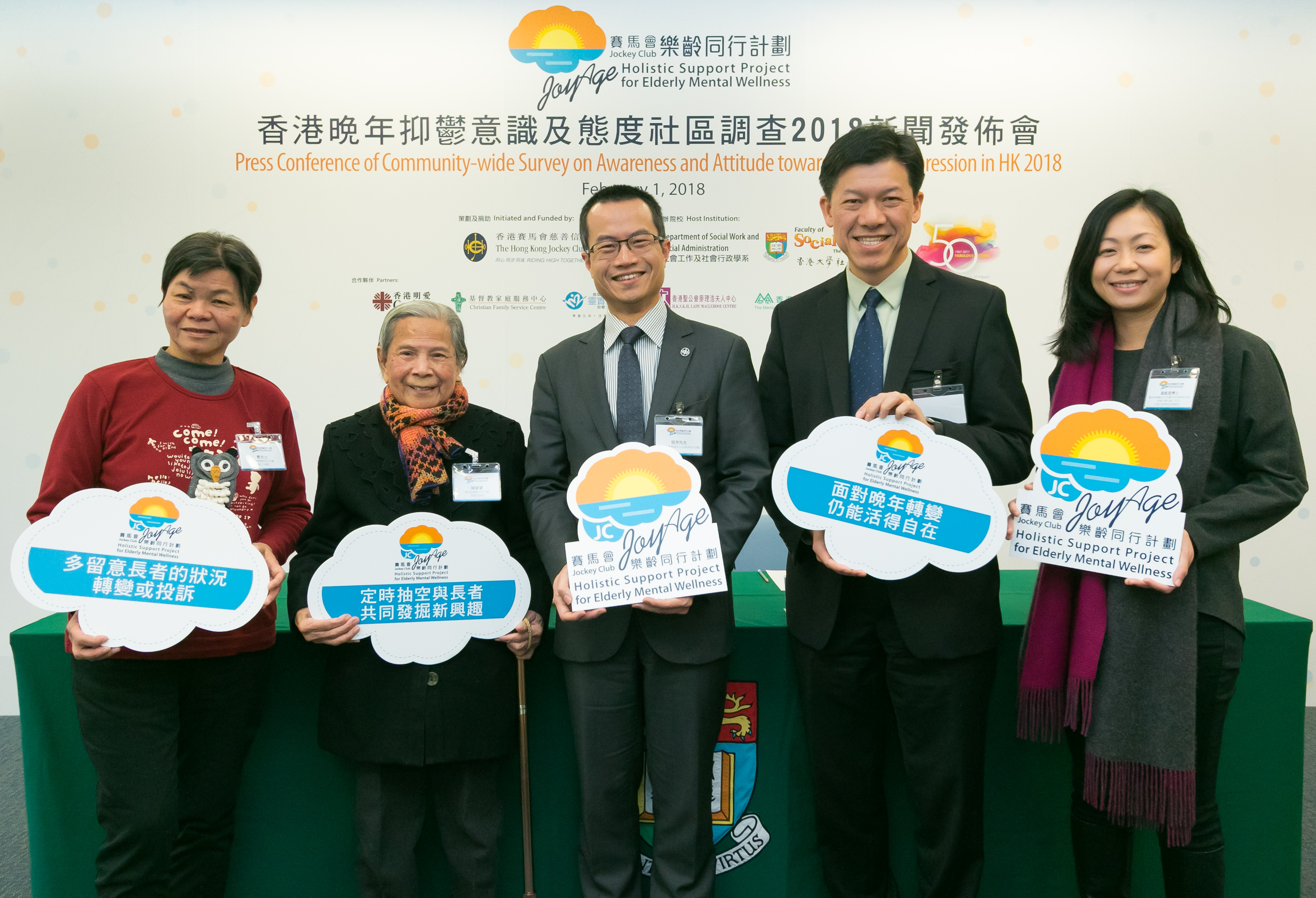 「賽馬會樂齡同行計劃」香港晚年抑鬱意識及態度社區調查2018 新聞發佈會: (右起) 香港大學社會科學學院社會工作及社會行政學系助理教授及「賽馬會樂齡同行計劃」共同首席研究員黃凱茵博士、香港大學社會科學學院社會工作及社會行政學系系主任及「賽馬會樂齡同行計劃」總監林一星教授、香港賽馬會慈善及社區事務執行總監張亮先生、服務受惠者陳婆婆及「賽馬會樂齡同行計劃」的「樂齡之友」曹女士。
