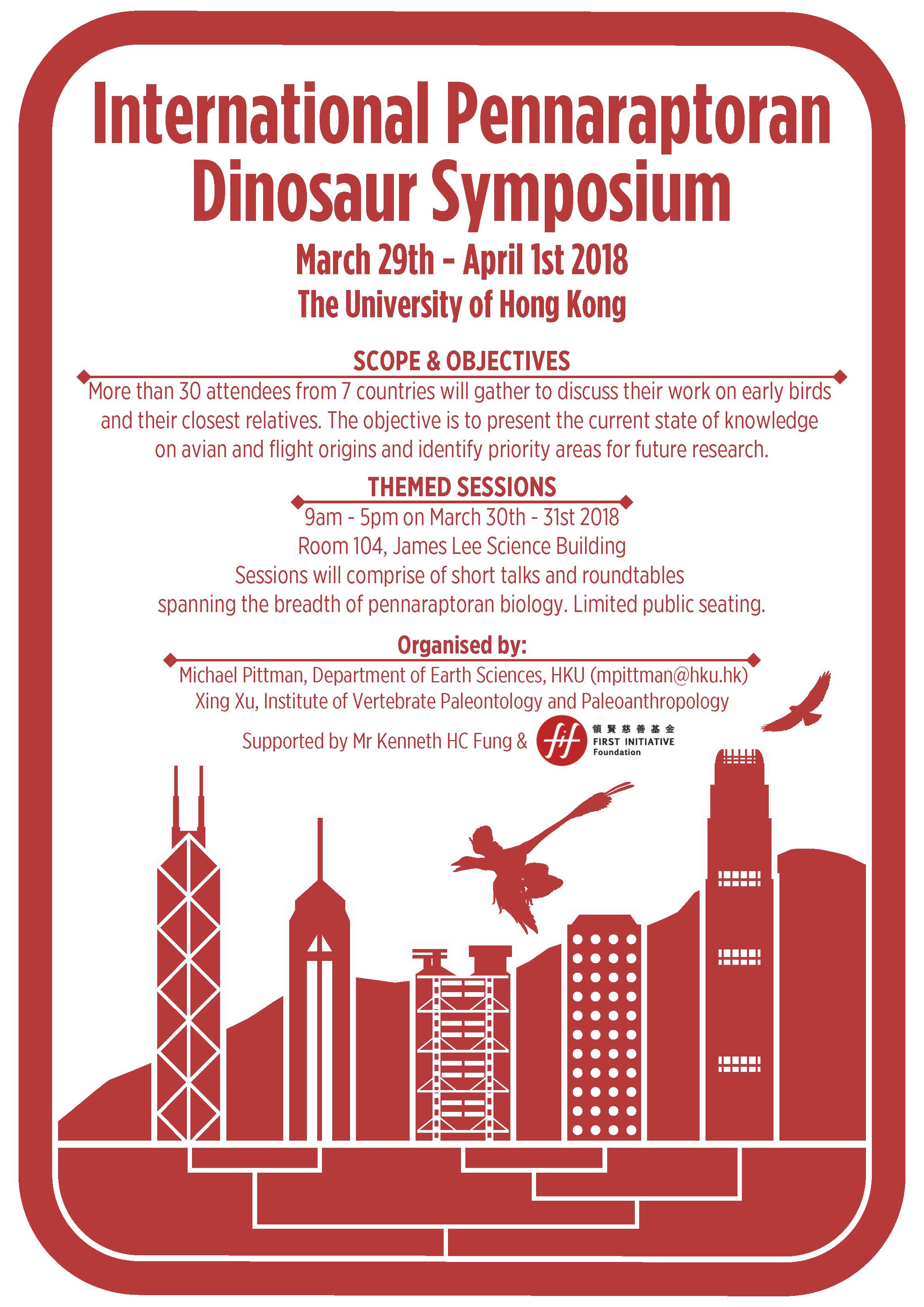「國際廓羽盜龍類恐龍研討會」的海報。是此有關鳥類和飛行能力起源的研討會將於2018年3月29日至4月1日在香港大學舉行,其中包括三十位來自七個國家的參加者。