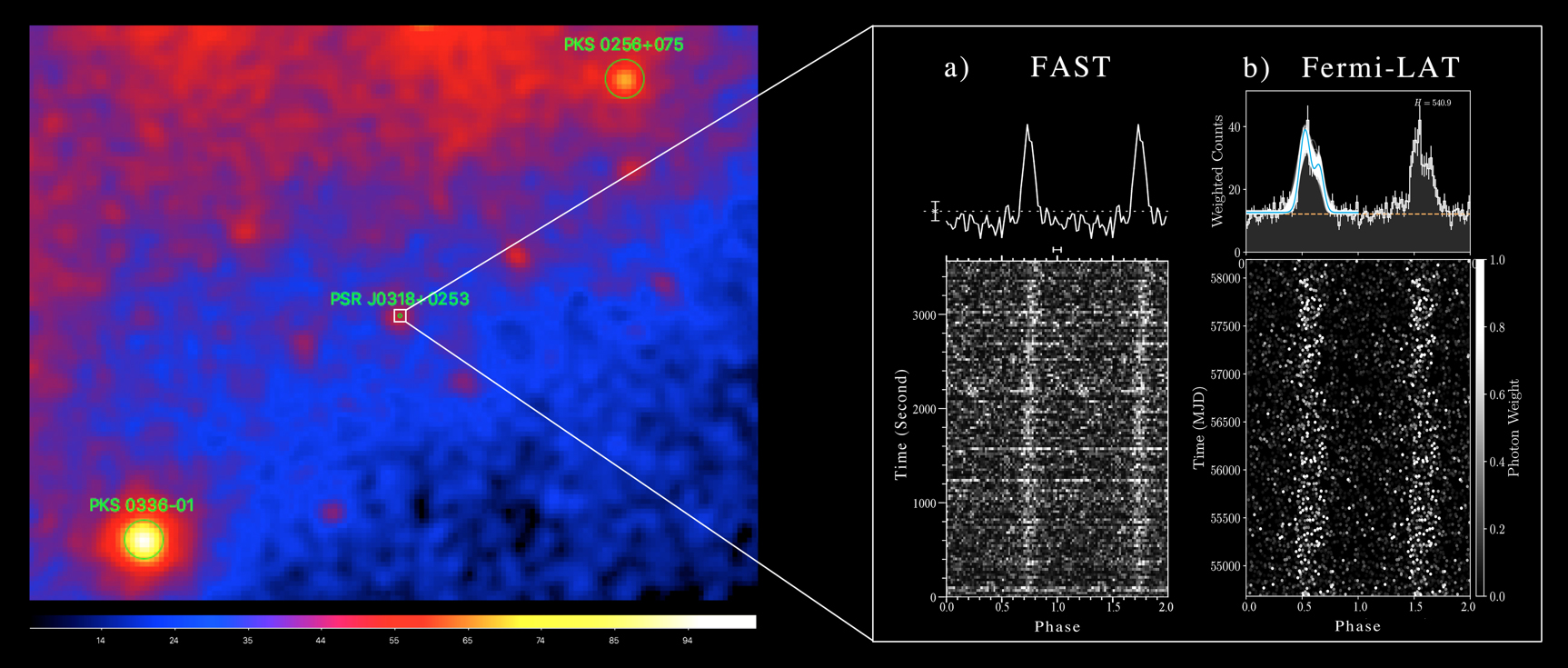 新發現的毫秒脈衝星(編號PSR J0318+0253)所在伽馬射綫巡天圖像的位置(左圖),以及FAST一小時觀測獲得的射電波段積分脈衝輪廓(右圖甲)和折叠Fermi-LAT累積9年數據所獲得的伽馬光子積分脈衝輪廓(右圖乙)