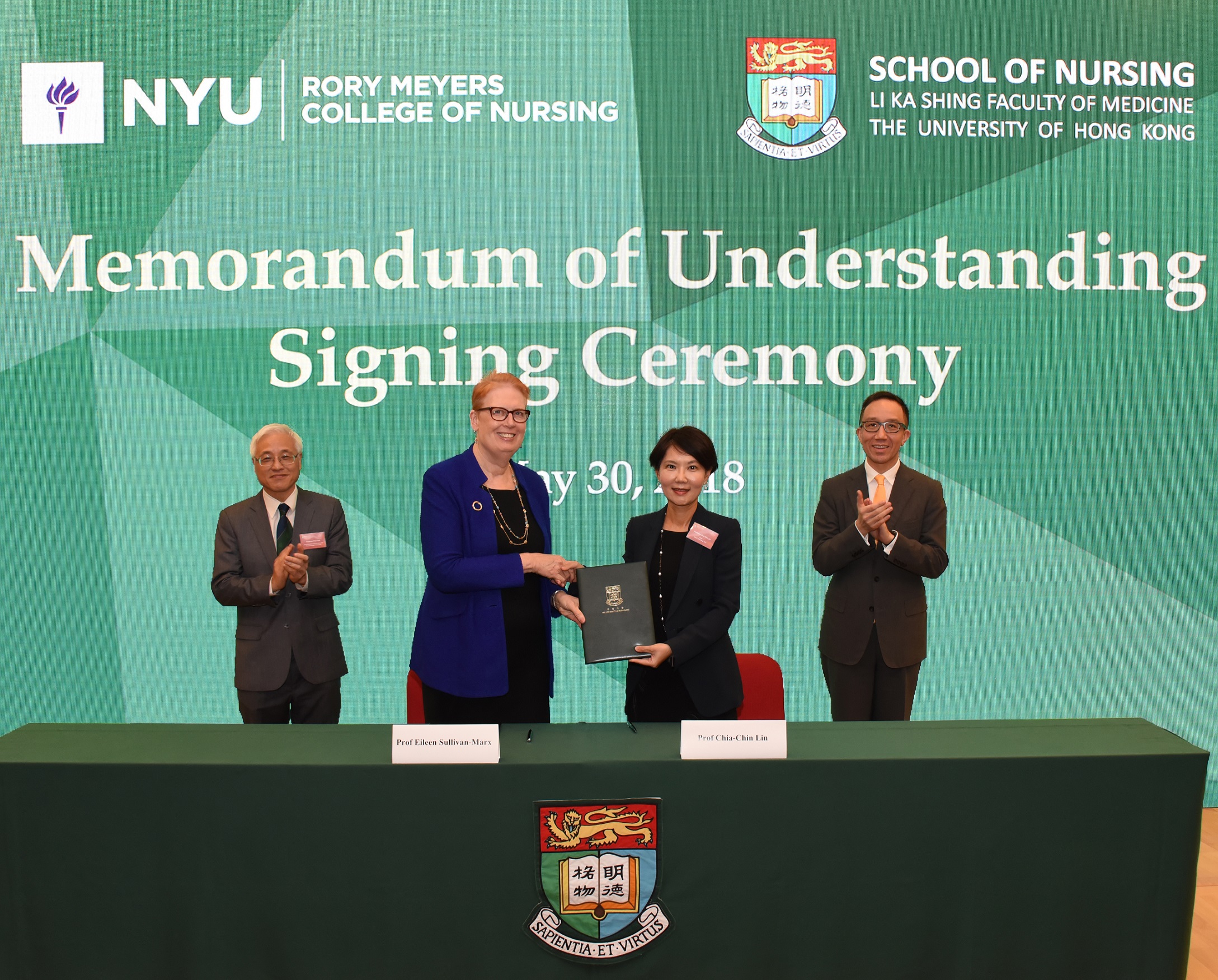於「第6屆楊雪姫演講」開幕禮前,香港大學李嘉誠醫學院護理學院與紐約大學Rory Meyers護理學院簽署協議備忘錄,以促進兩校護理教育及研究合作。