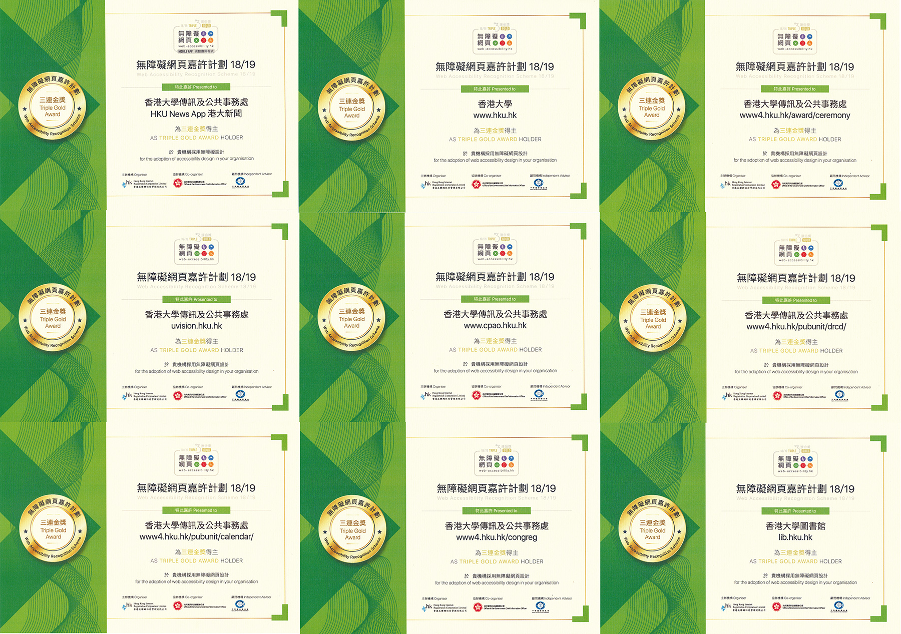 香港大學 (港大) 主網頁hku.hk 及其他港大網站再次獲「無障礙網頁嘉許計劃18/19」頒發「三年金獎」。頒獎典禮於今天(6月26日)舉行。