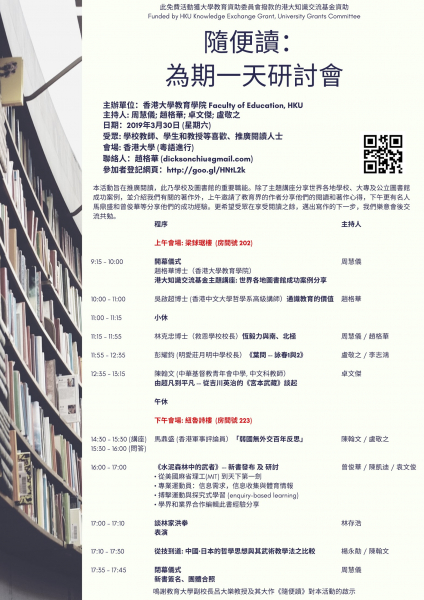 「隨便讀」研討會由香港大學教育學院主辦,並獲大學教育資助委員會撥款的港大知識交流基金資助。該活動旨在推廣閱讀,此亦屬學校及圖書館的重要職能。主題講座除了分享世界各地學校、大專及公立圖書館成功案例外,並介紹有關著作。同時,我們邀請了教育界的作者於研究會上午部分分享他們的閱讀和著作心得,資深評論員、著名專欄作家馬鼎盛先生和前財政司司長曾俊華先生等嘉賓於活動下午部分分享他們學習和寫作的成功經驗。我們希望參加者享受閱讀之餘,並邁出開始寫作的一步。我們亦樂意於活動後與參加者互相交流共勉。