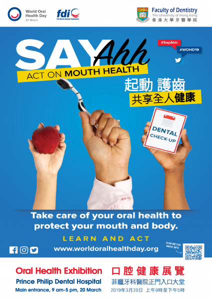 香港大學牙醫學院為響應「世界口腔健康日」,將於3月20日(星期三)在菲臘牙科醫院正門入口大堂舉辦口腔健康展覽,藉以增進公眾對口腔健康的認識,歡迎公眾參加。