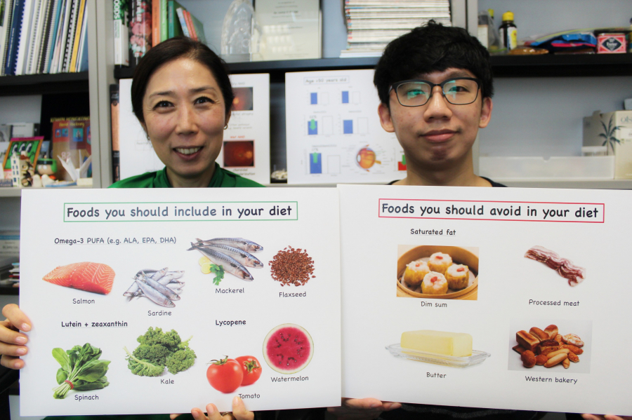 香港大學生物科學學院助理教授李忠英博士和博士研究生梁浩鏗,以及香港大學眼科學系榮譽臨床副教授王逸軒醫生和榮譽臨床助理教授伍立祺醫生在一項亞洲首例的觀察性研究中發現,香港人日常飲食中進食過多的紅肉,同時缺乏進食深海魚和深綠色蔬菜。攝取過多奧米加-6脂肪酸,及過少奧米加-3脂肪酸和類胡蘿蔔素均導致營養失衡,增加患濕性黃斑病變的風險。而不良的飲食習慣亦助長自由基所產生的脂肪酸氧化物,進一步增加了濕性黃斑病變發病的危險因素。