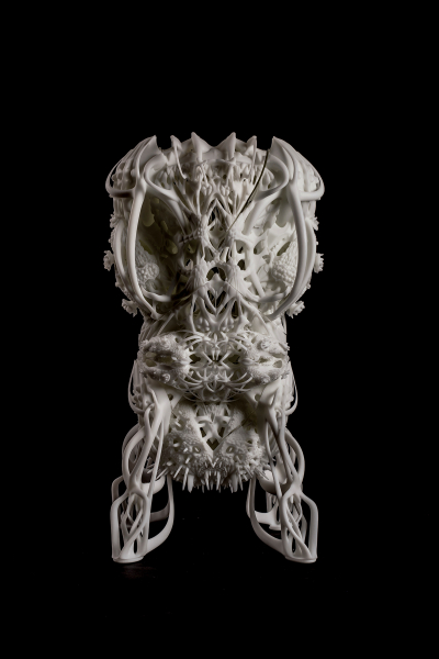 《蛻變或對抗》展示簡鳴謙對三維打印技術應用在建築、藝術、設計和互動媒體裝置等領域的探索。展覽以骨頭、面具、變異和力量四個獨特的領域,探索簡鳴謙過往十年的創作。每個展區的主題既揭示一眾作品之間的關係和演化,同時邀請觀眾投入其中,作出協商、演變或對抗。