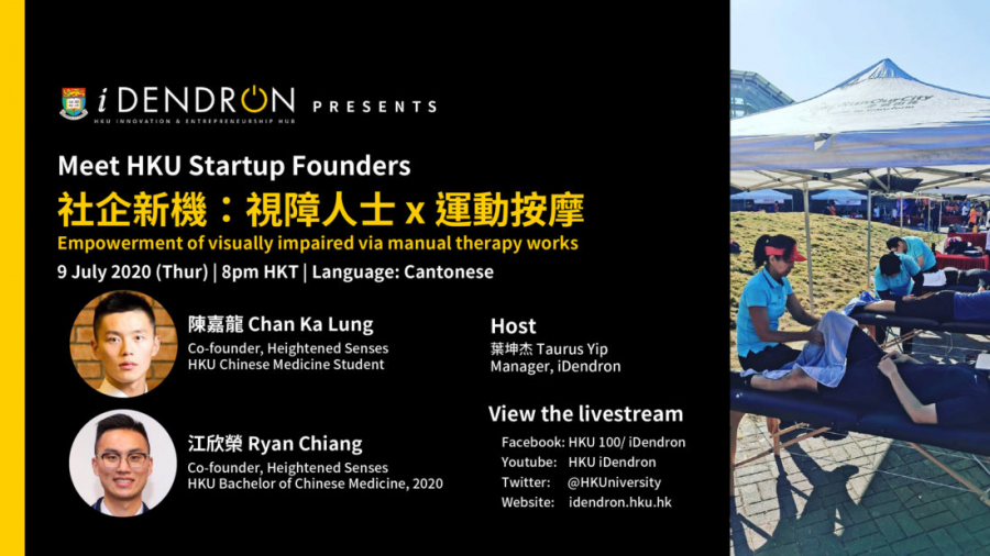 香港大學創新及創業中心iDendron推出「Meet HKU Startup Founders」節目系列,請來港大創業者分享,並回答觀眾問題。心視界有限公司旨在為視障按摩師提供可持續的教育及就業機會,為社區帶來正面影響。並於2019年香港社企挑戰賽中榮獲冠軍,2020年在亞洲社企創新獎賽事獲獎。