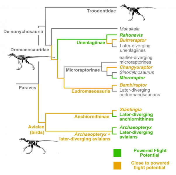 裴博士表示:「我們的演化樹支持了馳龍科(盜龍)和傷齒龍科獸腳類恐龍是鳥類最近親的傳統觀念。它也支持了具爭議性的近鳥龍類獸腳類恐龍是最早的鳥類。」利用這個新的演化樹,研究團隊通過運用現代鳥類飛行的知識,重構了似鳥獸腳類恐龍的飛行能力演化過程。團隊發現飛行潛能曾在獸腳類獨立進化至少三次:一次在鳥類,兩次在馳龍類。文博士續說:「之前的研究顯示,某些馳龍類有滑翔飛行的能力,而我們發現馳龍類中有至少兩個驅動飛行潛能的起源,這令人非常興奮。」最關鍵的是團隊發現很多鳥類近親的祖先其實已經十分接近進化出驅動飛行潛能的門檻,「這顯示獸腳類恐龍在進化出飛行能力前,曾廣泛地試驗羽翼的用途,推翻了認為只有某個群組曾進行此實驗的觀念。」文博士補充。