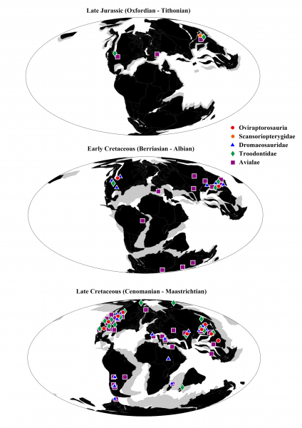 第一部分:化石記錄、系統分類學和生物地理學——概括了廓羽盜龍類的化石記錄,並將注意力集中在一些能解決迫切性問題的新發現上。這部分也展示了廓羽盜龍類各類群的進化關係(圖二),為了解牠們的進化提供了一個重要框架。它更包含了首個針對虛骨龍類獸腳類分佈(古生物地理學;圖三)的定量分析,以研究板塊運動如何推動牠們的進化。