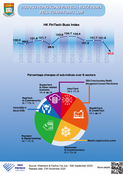 2020年第三季度的香港金融科技市場情緒指數,分析了季度内1,299條有關金融科技的新聞報導,指數值跌至93.5的歷史低位,較2020年第二季度大幅下跌8.1個指數點(或7.97%),較去年同期下跌10.9個指數點(或10.4%),延續自2019年第二季度起的下跌趨勢。