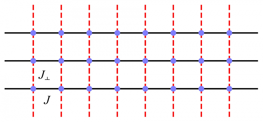為了研究量子多體系統的微觀機制,計算物理學家們往往會根據已有的理論認識和實驗數據,總結設計出理論模型,再依據相關理論預言,在合適的參數範圍内對這些模型做數值模擬。對量子材料中希格斯模式的探索便是這樣的一個過程。不過,在觀測希格斯模式的道路上,依舊是充滿挑戰。從量子理論的角度出發,科學家們提出兩種尋找清晰的希格斯模式信號的方法。其中一種是在量子相變點附近尋找。遵循此路,科學家們獲得不少令人欣喜的結果,例如在C9H18N2CuBr4中觀測到希格斯模式的信號等。其二是在從二維降維到一維的過程中尋找希格斯模式。如此的降維過程能削弱模型的長程序,從而抑制希格斯模式的過阻尼過程。與前一種方法比較下,這種方法相對難以實現,而留有不少空白。來自香港大學、中山大學、密歇根大學和猶他州大學的研究團隊決意填補這些空白,他們設計了一個跨維度量子自旋模型的耦合自旋鏈(如圖一所示)。