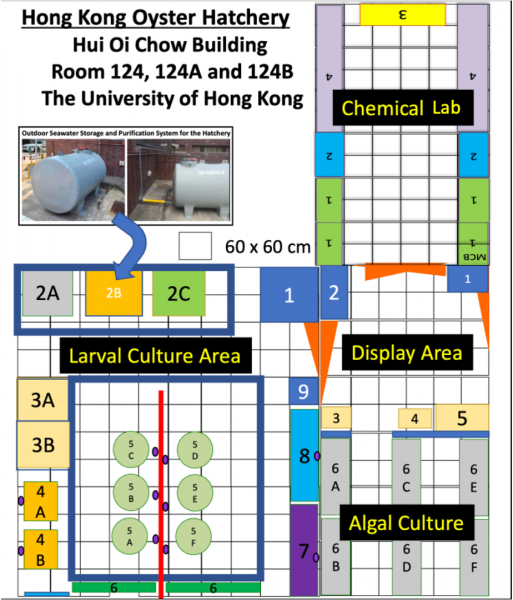 - 孵化場設有一個藻類養殖區(Algal Culture Area),為生蠔幼蟲和幼苗提供充足的食物。