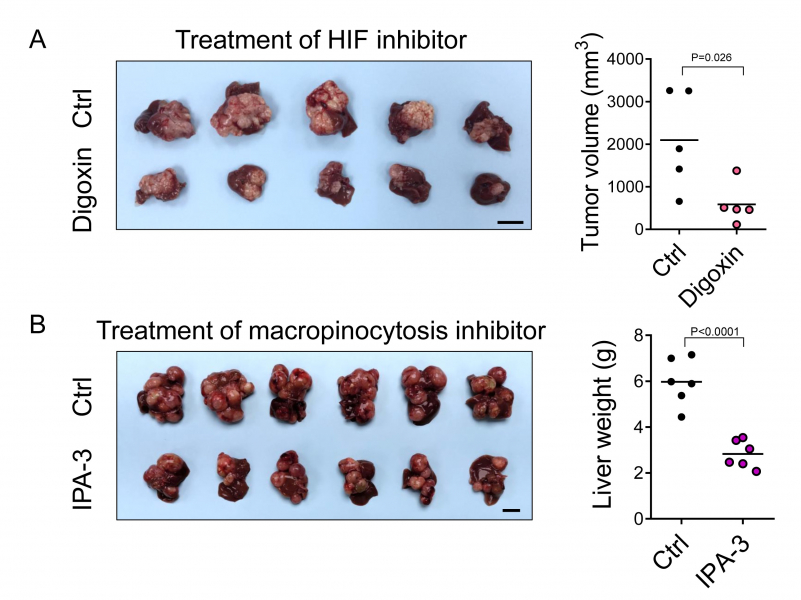 巨胞飲是一種細胞內吞機制,允許細胞吞噬細胞外的蛋白質。通過共聚焦顯微鏡,研究團隊發現在缺氧條件下,能提高HCC細胞的巨胞飲水平達5至10倍。研究團隊通過質譜分析進一步發現,巨胞飲作用吞噬的蛋白質在細胞內被降解為氨基酸,這些氨基酸可作為肝癌細胞生長的燃料。在分子機制上,這一過程由HIF-1 轉錄激活一種稱為 EH 結構域蛋白 2(EHD2)的基因所介導。 EHD2驅動膜皺褶的形成,是促使巨胞飲順利進行的首個關鍵步驟。研究團隊從動物實驗中發現,在小鼠內剔除EHD2基因,可有效抑制肝細胞癌生長。HIF抑制劑Digoxin或巨胞飲抑制劑 IPA-3 ,均在小鼠 HCC 模型中成功抑制腫瘤生長超過 50%(圖A、圖B)。更重要的是,基因EHD2 在約四成肝細胞癌患者中顯著過度表達至少兩倍以上。綜上所述,是項研究結果揭示了一個新的代謝途徑,即HIF-1/EHD2 介導的巨胞飲會支持肝細胞癌生長。因此,抑制巨胞飲作用或為一種治療肝細胞癌的可行方法。