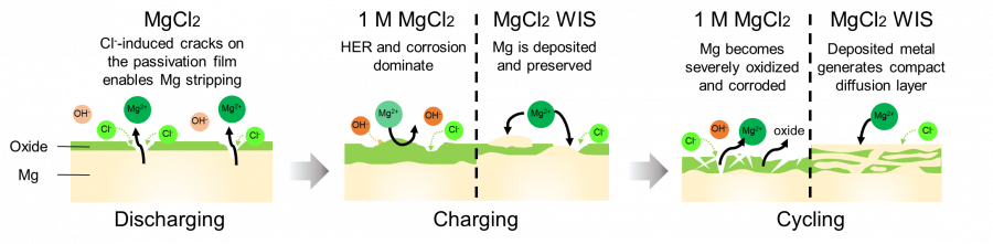 電解液中氯離子的吸附也是調節鈍化膜形成的關鍵。研究小組發現,氯離子的吸附可以幫助溶解氧化物、暴露原生金屬讓氧化還原反應能夠順利進行,再加上電解質中游離水稀缺,這種鹽包水電解質得以成功對抗鎂金屬的鈍化。