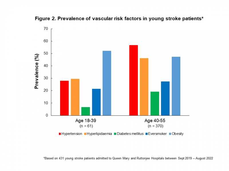 為了解年輕中風的風險因素,該研究分析2019年9月至2022年8月期間,431名18至55歲到瑪麗醫院及律敦治醫院求醫的中風病人,發現當中53%患有高血壓、44%患有高血脂、26%曾吸煙、19%患者肥胖,以及17%患有糖尿病(圖2);而患有高血壓、高血脂及糖尿病的病人中,分別有33%、64%及23%在中風入院時,才被診斷出上述狀況。