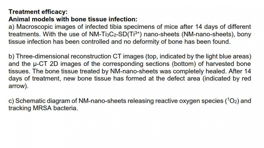 研究團隊最近開發的新型二維聲敏劑,名為Ti3C2-SD(Ti3+)納米片(納米片)。相較物理上排列為零維度 (zero-dimension) 的傳統聲敏劑,其能產生的活性氧數量有限。團隊新研發的聲敏劑,含有大量二維度平面 (two-dimension) 的催化面,在超聲波感應下,新的二維聲敏劑能有效地產生大量的活性氧作為殺菌劑。納米片在超聲波誘導下,加上利用中性粒細胞膜 (NM) 表面修飾技術,NM-納米片能主動追蹤埋藏於骨組織中如MRSA的病原體。在小鼠模型中,這款新型納米片能夠在骨組織中消除超過99.72%的MRSA細菌;但在對照組使用萬古黴素 (Vanco) 作為抗生素治療的,卻未發現有顯著的治療效果。此外,當骨組織感染得到控制,NM-納米片還可以減輕炎症並有助修復骨組織。在生物安全的考慮上,團隊也沒有發現納米片有任何明顯的風險。