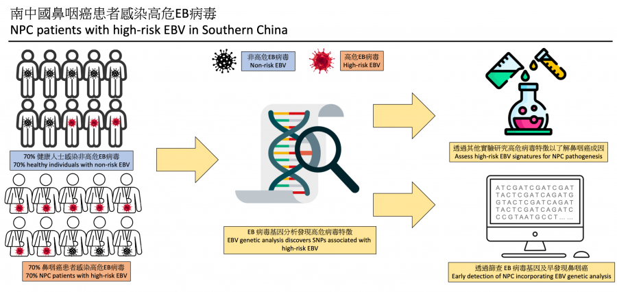 EB病毒與鼻咽癌的發展密切相關。然而,近期由港大醫學院及中山大學腫瘤防治中心團隊進行的研究顯示,某些EB病毒變異體可能會增加個別人士患上鼻咽癌的風險。鼻咽癌通常在疾病晚期診斷出來,早期檢測將顯著提高患者的生存率,並減少治療帶來的長期副作用,因此持續研究和提高公眾對鼻咽癌致病因素的認識十分重要。