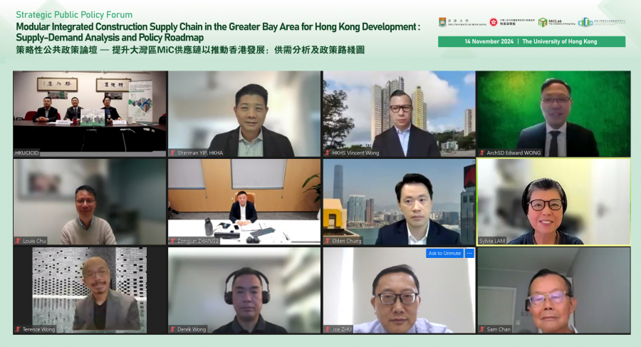 香港大學土木工程系模塊組合建造實驗室(MiCLab)與建造及基建創新研究中心(CICID)於11月14日線上舉辦了策略性公共政策論壇,並發佈了名為「提升大灣區組裝合成建築法(MiC)供應鏈以推動香港發展:供需分析與政策路線圖」研究報告,該項目由香港特別行政區特首政策組策略性公共政策研究資助計劃撥款資助。此次活動邀請了來自政府、業界和學術界等相關持份者,分享了 MiC 供應鏈政策及相關實踐的最新進展和見解。合共280多位嘉賓參加了論壇。