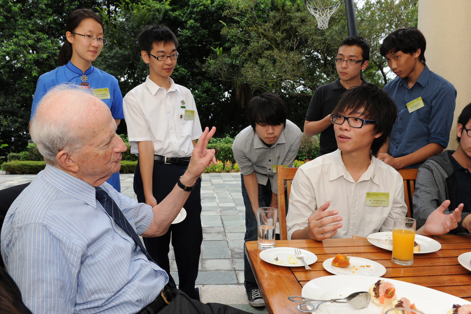 20名中學預科生和港大學生參加「樂膳‧好師 與諾貝爾學人對談」,與諾貝爾經濟學獎得主加里‧貝克爾教授合照 學生與加里‧貝克爾教授共進午膳,輕鬆交流 |