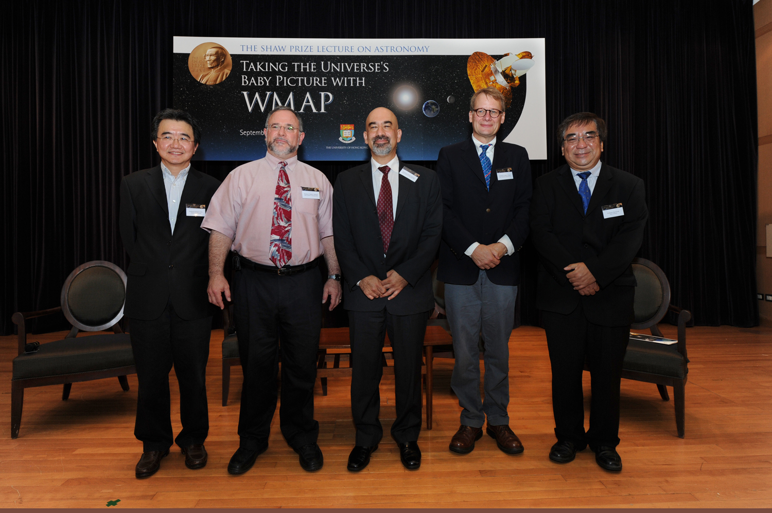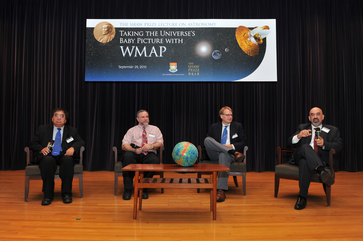 2010年度邵逸夫天文學獎得獎人查理斯‧班尼特教授(Professor Charles L Bennet)、萊曼‧佩治教授(Professor Lyman A Page Jr)及大衛‧斯佩格教授(Professor David N Spergel),於今日(9月29日)在香港大學舉行講座,講述如何以宇宙誕生時遺下的微波輻射,精確地測量出宇宙的年齡、幾何和組成,解開一連串宇宙學之謎。