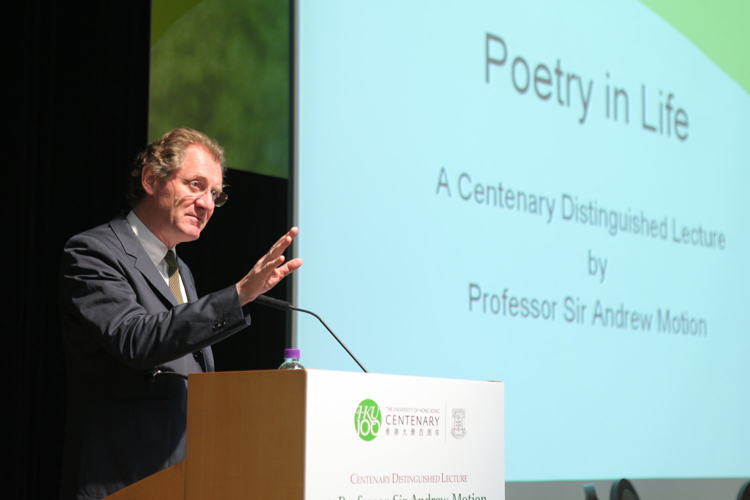 為慶祝建校百周年,香港大學舉辦一系列「百周年傑出學人講座」,作為校慶活動之一。第三場講座於今天(3月10日)舉行,邀得1999-2009年英國桂冠詩人安德魯‧莫遜(Professor Sir Andrew Motion)主講。