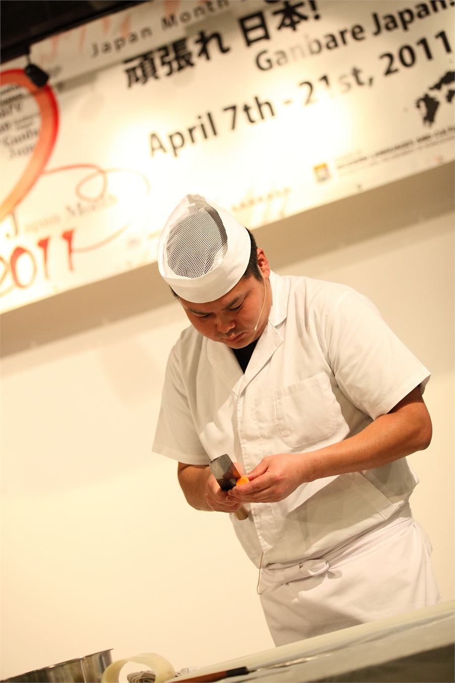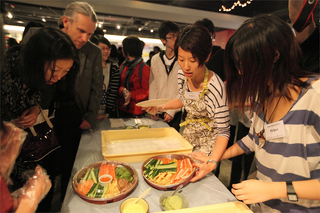 香港大學《日本月2011》今天(4月7日)在港大國際交流中心(Global Lounge)舉行的日本美食工作坊揭開序幕,日本總領事公邸主廚實川佳裕先生在港大校園炮製他譽滿全城的日本菜。參與日本美食工作坊的同學在實川佳裕先生的指導下,做出個人特色手卷壽司。