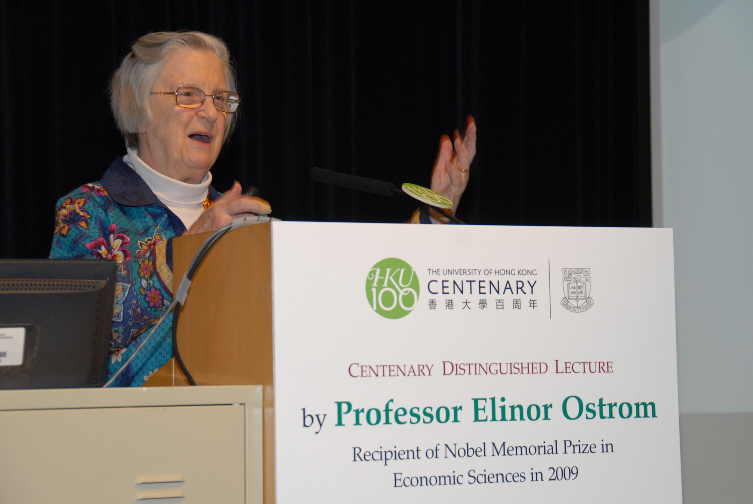 香港大學(港大)慶祝建校百周年,舉辦一系列「百周年傑出學人講座」,邀請多位國際知名學者主講,把世界級學術視野帶到港大。諾貝爾經濟學獎得主艾莉諾‧奧斯特羅姆教授(Professor Elinor Ostrom)今天(5月3日)在港大以「環境保護與環保政治的反思」為題,主講第六場「百周年傑出學人講座」。