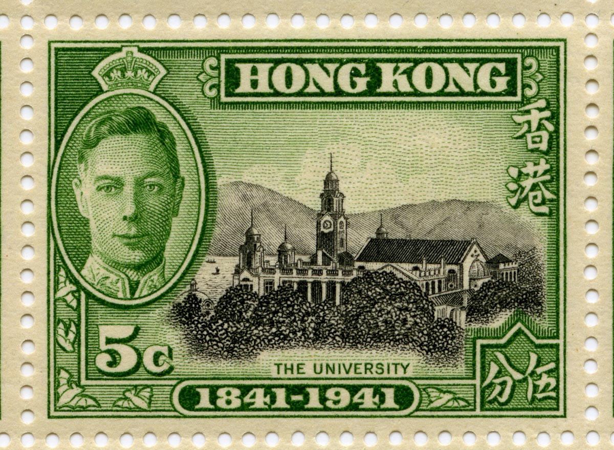 1941年香港開埠百周年紀念郵票,印有英皇佐治五世和香港大學圖樣 |