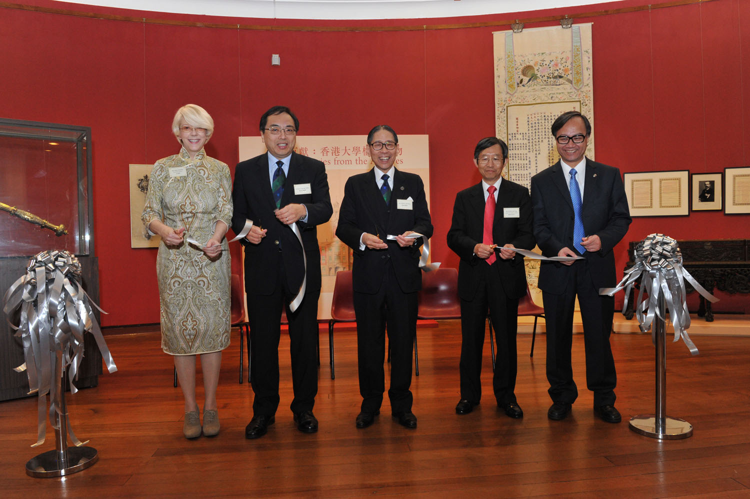 (左起) 香港大學檔案中心古達詩總監、香港大學校長徐立之教授、香港大學校務委員會主席梁智鴻醫生、杜鵑(1972) 基金管理委員會主席黃啟民先生以及美術博物館楊春棠總監主持開幕儀式。 |