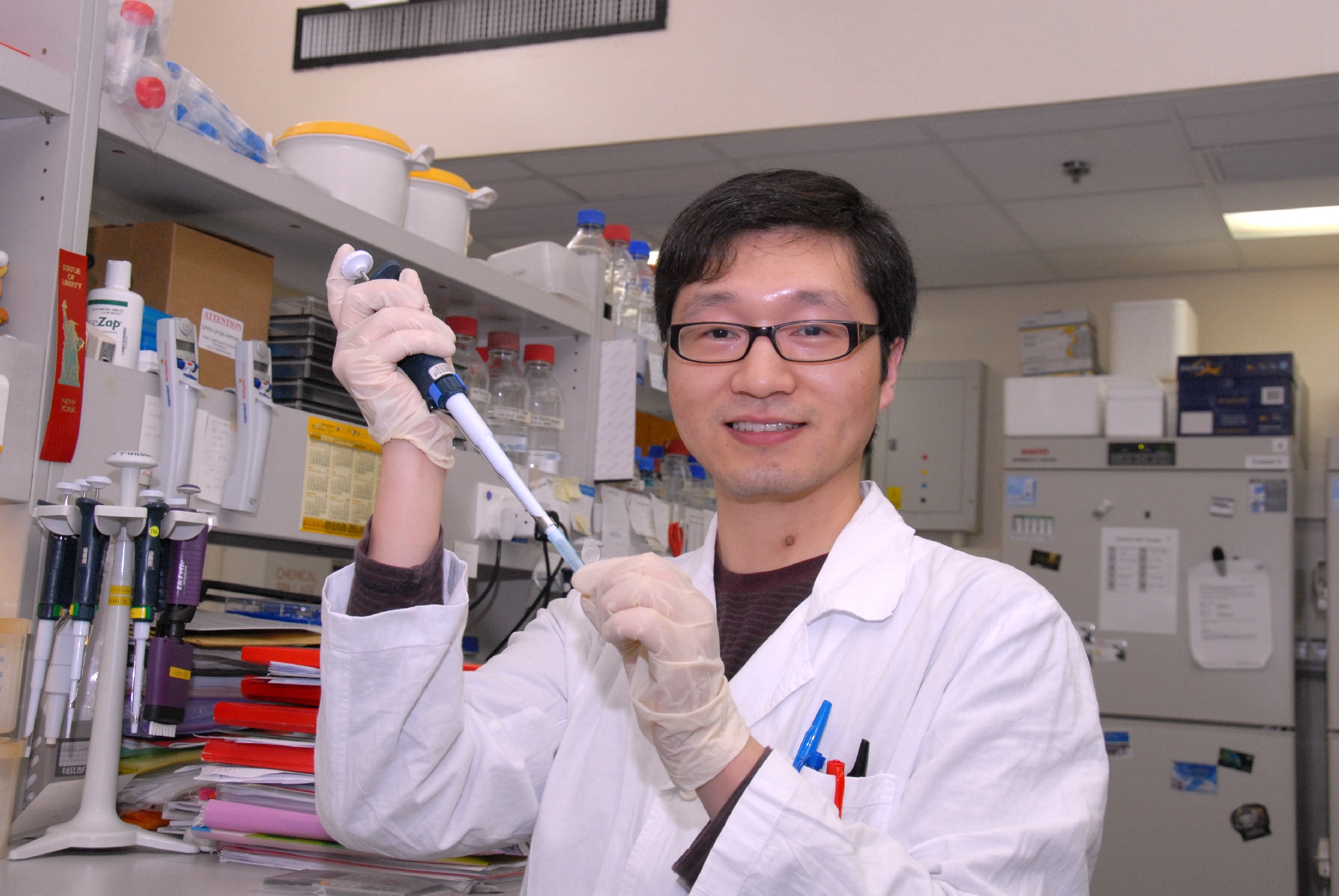 闞君鎖博士正從樣本提取胃癌基因 |