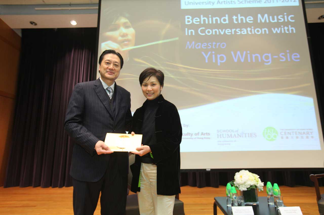 港大人文學院院長蔡寬量教授在座談會上,感謝學院藝術家計劃的贊助人陳正欣先生慷慨支持。陳先生致送「港大百周年紀念郵票」予葉詠詩,感謝她分享自己對音樂的看法及透過藝術,感染他人。