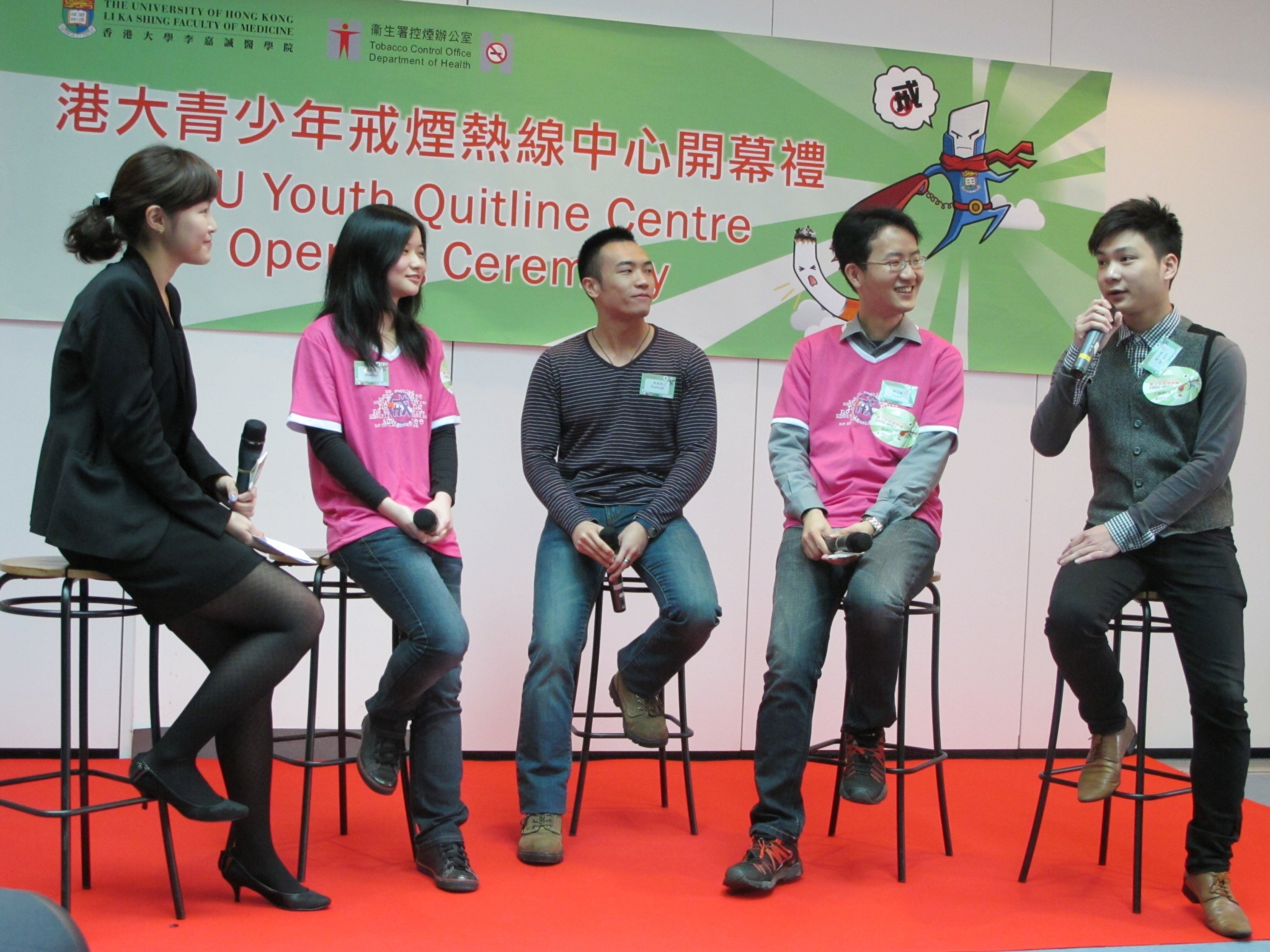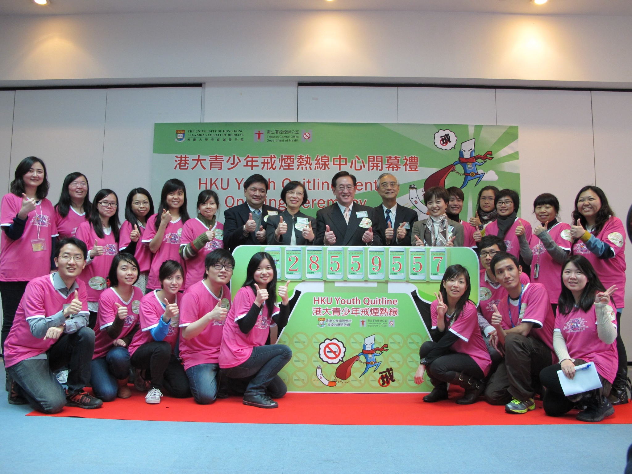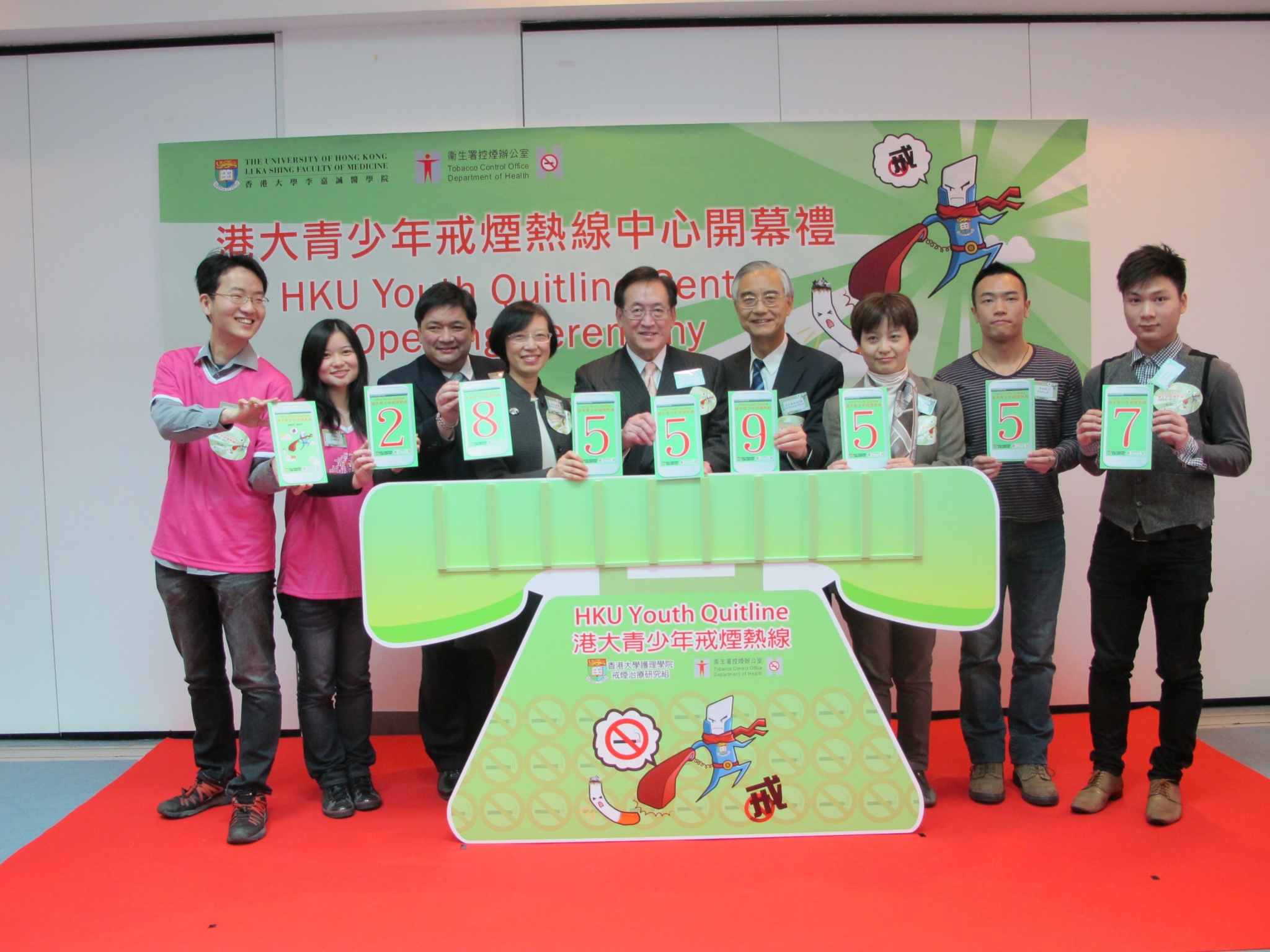 青少年戒煙熱線中心開幕禮於今天(3月15日)假港大舉行,並由食物及衛生局局長周一嶽醫生GBS, JP、衛生署控煙辦公室主管何理明醫生、港大護理學院教授兼青少年戒煙熱線計劃總監陳肇始教授、港大公共衛生學院院長羅旭龢基金教授(公共衛生學)林大慶教授及香港吸煙與健康委員會主席劉文文女士MH, JP主持。周一嶽醫生表示:「近七成習慣每日吸煙人士是在20歲前開始吸煙,因此加強針對青少年的控煙工作,對減少吸煙人口至為重要。」