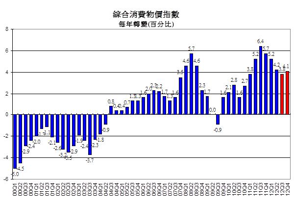 - 以綜合消費物價指數量度,2012年8月一般價格水平上升了3.8%,在2012年第二季整體消費通脹率為4.2%。若沒有財政措施,基本通脹在第二季會維持在5.1%。在食物價格與租金的增長放緩下,預料通脹壓力進一步舒緩。預料通脹率在2012年第三季增長3.8%,而第四季增長則為4.1%。預期整體消費通脹率在2012年為4.3%,相比2011年則為5.3%。