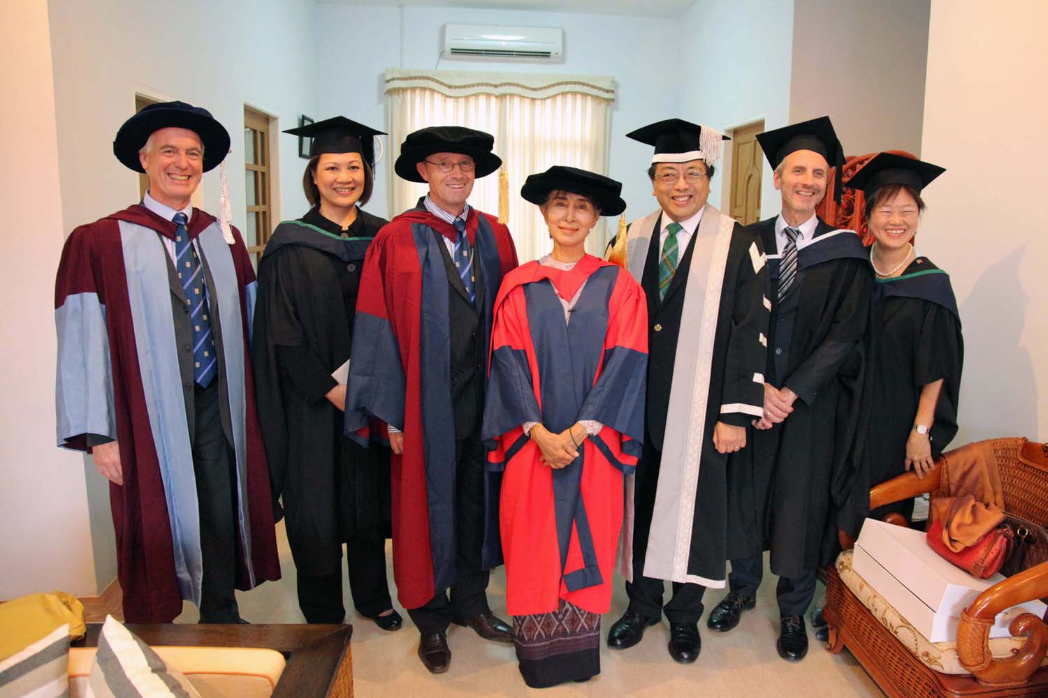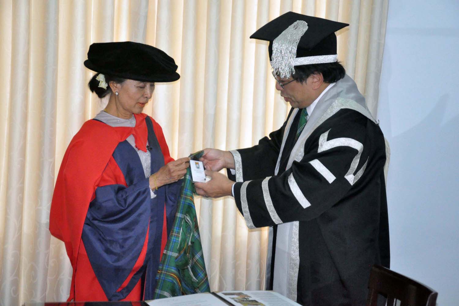 昂山素姬女士在港大三月份舉行的第一百八十六屆名譽博士學位頒授典禮上,獲缺席頒發名譽法學博士,以表彰她致力以非暴力的方式爭取民主和人權。在星期二舉行的儀式上,昂山素姬女士接過並穿上由徐教授代表大學送贈的名譽法學博士袍,然後在名譽畢業生名冊上簽署,完成學位的整個頒授程序。